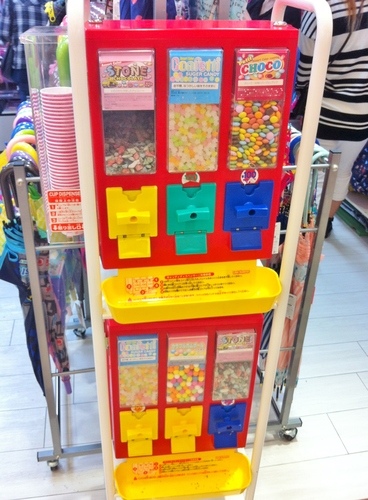 這跟轉扭蛋有點像,就是拿旁邊的杯子,然後投錢轉,一定分量的糖果就會掉下來。